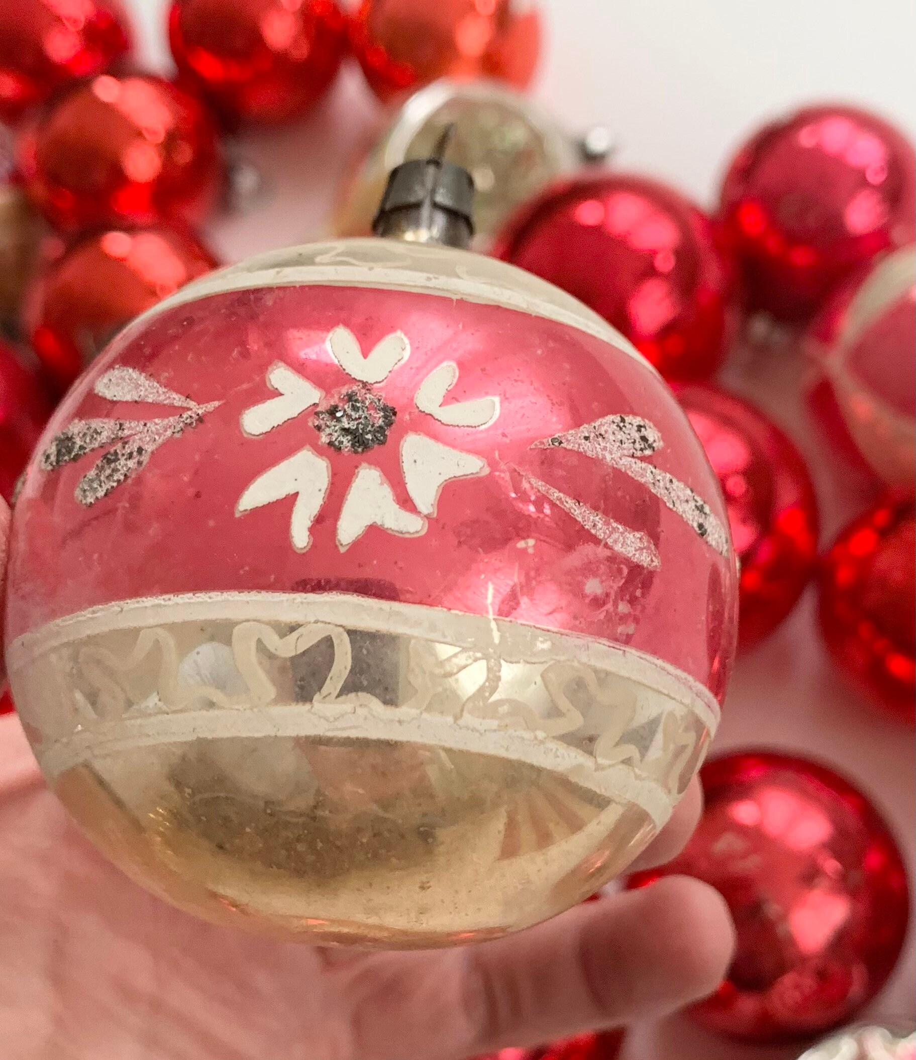 Mixed lot of 37 vintage glass ornaments in shades of red and silver