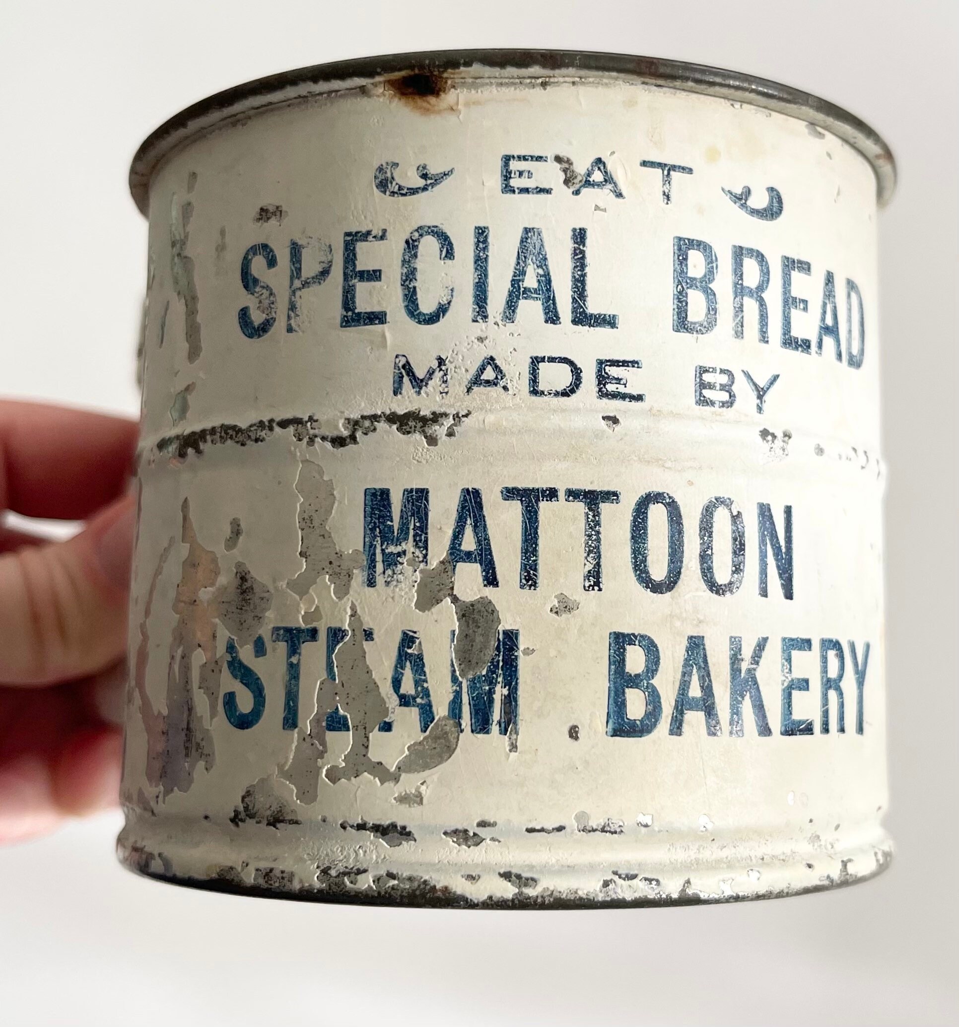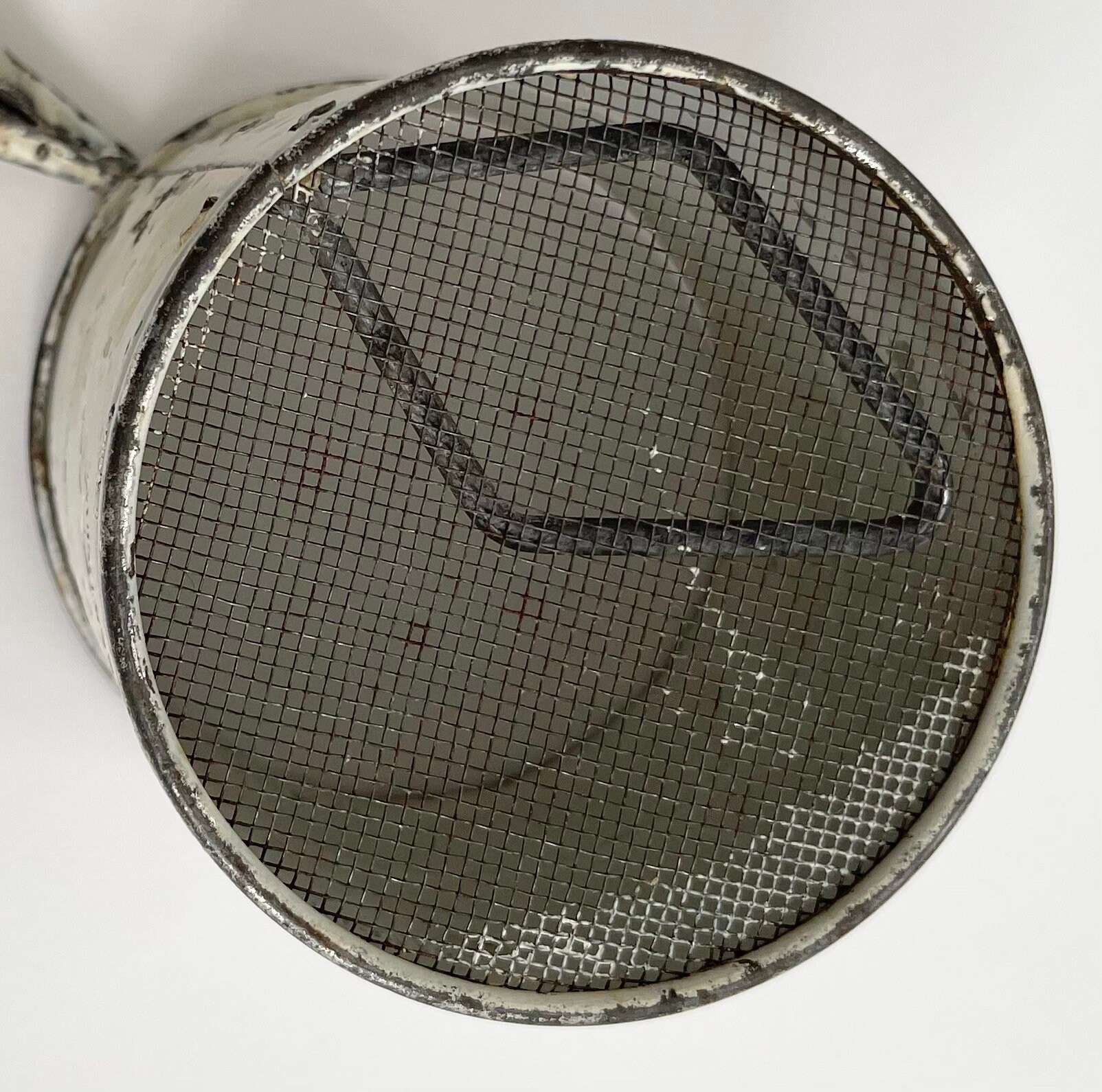 Fair vintage condition with a very aged patina and old remnants of dried up flour in the metal screen that I can get out. That said, this piece is better used for display rather than for actual cooking.