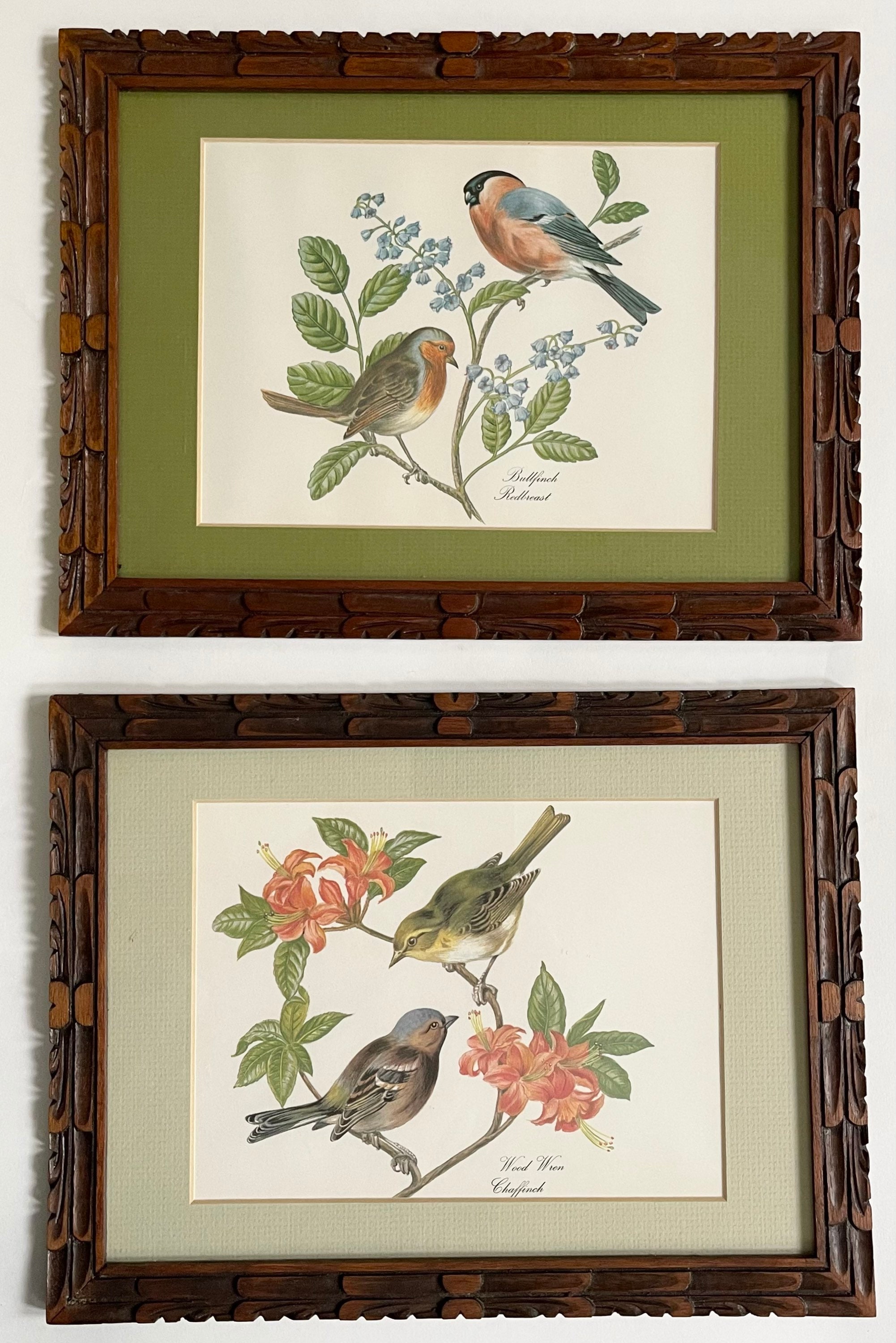 Botanical Bird Framed Prints Pair Set of Two Carved Wood Frames Soft Neutral Palette Natural Floral Plant Subject Horizontal Aligned Framed